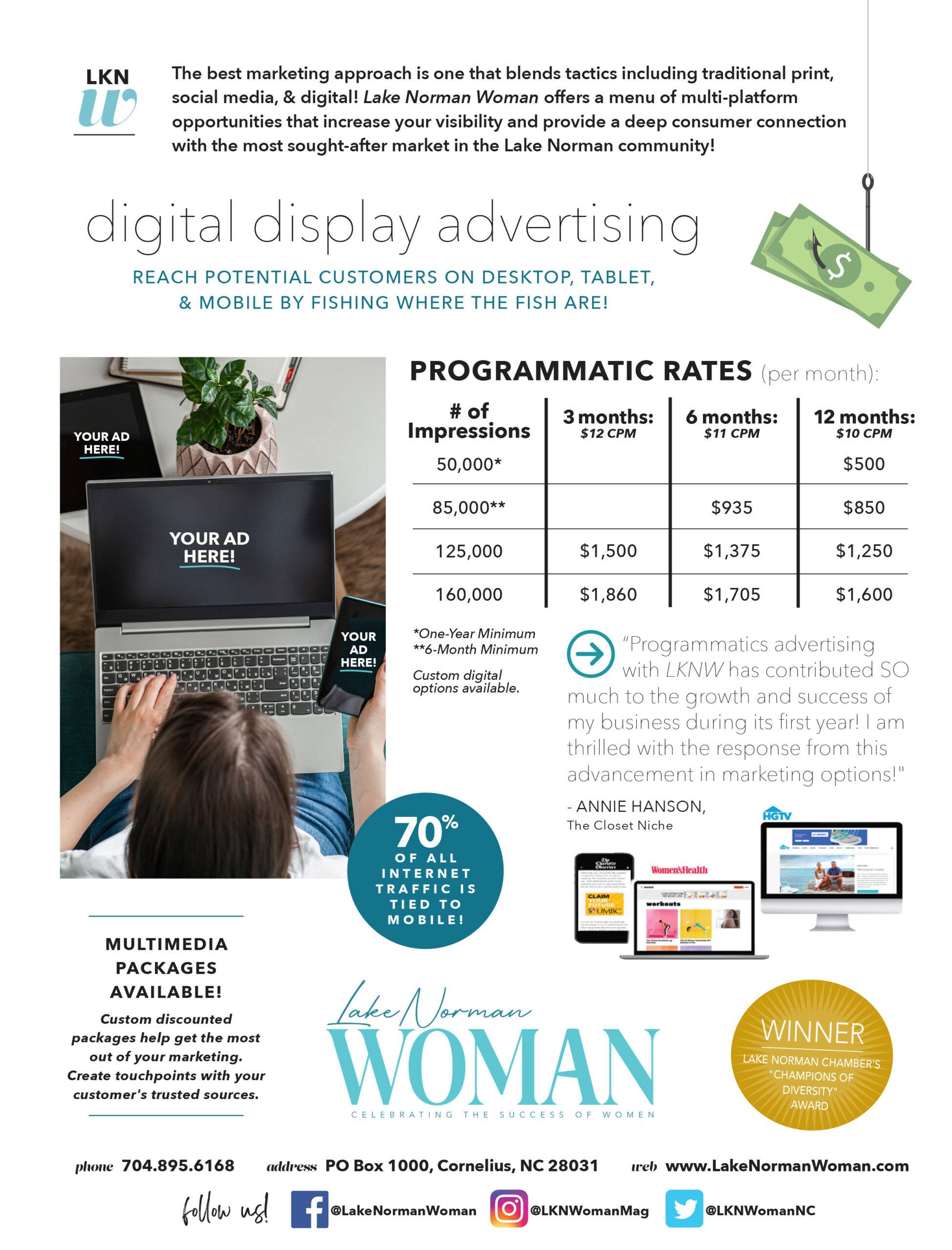 WSIC and Lake Norman Woman deliver one of the region’s strongest and most affordable programmatic advertising networks. With 100K+ monthly website visitors, millions of impressions, and a combined audience of 90K+ local residents, we help businesses of every size reach the people who matter most—right here in Lake Norman.